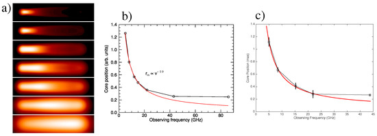(a) A sequence of simulated synchrotron total intensity images computed at 86, 43, 22, 15, 12, 8, and 5 GHz, respectively, using a relativistic hydrodynamical model of a jet with a recollimation shock; (b) Position of the simulated core as a function of frequency. The red curve indicates the best fit to the core positions between 5 and 22 GHz, which follows the canonical Blandford & Königl jet model. The 43 and 86 GHz data clearly deviate from the opacity core-shift curve, revealing the recollimation shock; (c) Astrometric core-shifts of BL Lac between 4.8 and 43 GHz, plotted as a function of frequency, adapted from Dodson et al. [30]. Overlaid in red is the model from the fitting of the cm-wavelength data (where κ is −0.99 and is 5.3 mas GHz).