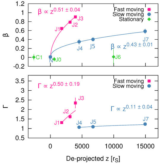 1. Vlahakis, N.; Königl, A. Magnetic Driving of Relativistic Outflows in Active Galactic Nuclei. I. Interpretation of Parsec-Scale Accelerations. Astrophys. J. 2004, 605, 656–661. [Google Scholar] [CrossRef]