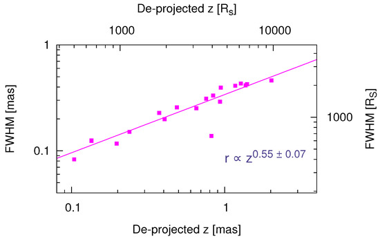 Figure 3. Power-law fit of the jet width (FWHM = 2*radius r) versus de-projected distance from the core, as inferred from MODELFIT [14]. Credit: Boccardi et al., A&A, 585, A33 (2016), reproduced with permission ©ESO.