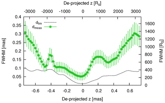 With the aim of determining the transverse width profile at the base of the two-sided flow, a pixel based analysis of the stacked map, which was convolved with a circular beam of 0 . 1 mas , was carried out in AIPS. With the task SLICE, the image was sliced along the jet axis; then, a Gaussian fit was performed with SLFIT for describing the transverse intensity distribution at each pixel ( 1 p x = 0 . 02 mas ). Results concerning the central 1 . 5 mas of the source are shown in Figure 5. The green dots indicate the measured transverse width d meas as a function of distance from the core z, while the black dotted line represents the profile of the formal resolution limit d lim , calculated based on the signal to noise ratio at each slice as [21]: