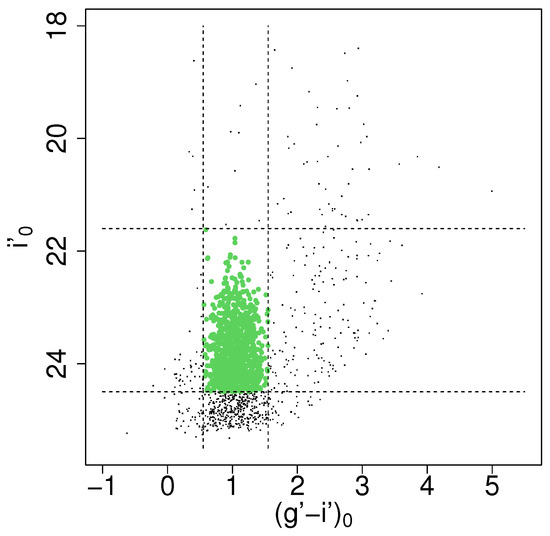 Color-magnitude diagram for all point-like objects. Green dots represent the globular cluster (GC) candidates.