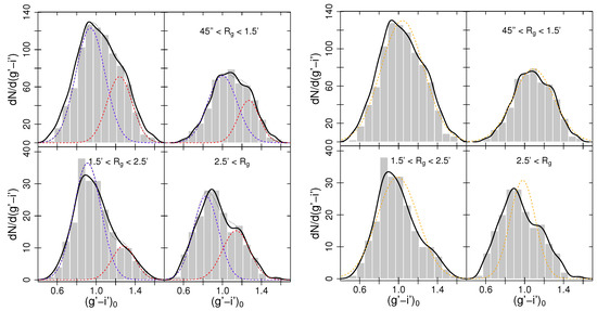 In Figure 2, we present the same four histograms in both panels, each corresponding to a different range of galactocentric distance except for the first one, which shows the entire population. In these histograms, the color distribution of the system is shown with Gaussian functions fitted using GMM [13] for a bimodal distribution (left panel) and a unimodal distribution (right panel). Though it can be seen that in the exterior region and the total population there is a strong tendency towards bimodality, the statistic parameters of these fits (D and the kurtosis) were not conclusive. It is expected that applying the background correction, as we intend to do in the near future, will help produce more definitive results.