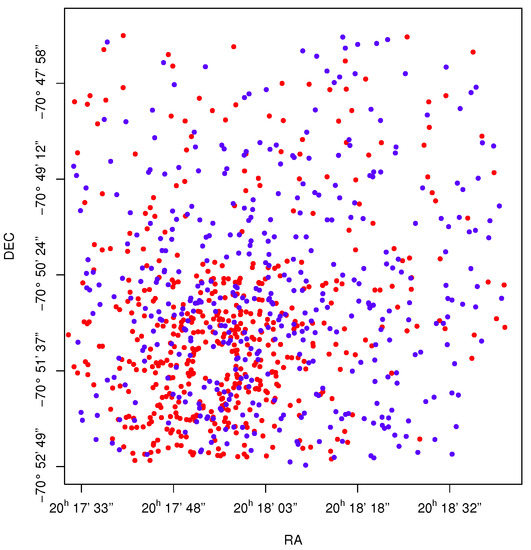 Spatial distribution for all GCs. Red and blue dots separate the metal-rich and metal-poor sub-populations, with the limit between them (obtained from the color distribution) at .