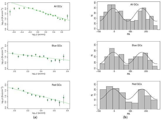The previous result is confirmed by the radial distribution, shown in Figure 5a. Here, a power law was fitted to the distributions, and the slope obtained for the red sub-population is considerably larger than the one obtained for the blue sub-population and the one for the entire system, indicating that it is more concentrated towards the center. The plot for the totality of the GCs reaches the inner regions of the galaxy, showing that the distribution in this region turns flat. This is both because of the saturation of the images in this area, and because of the disruption of GCs being more frequent closer to the galactic center due to tidal forces being stronger.