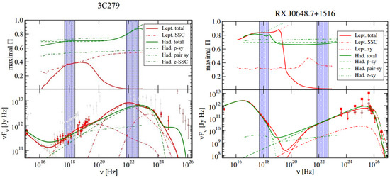 UV through -ray SEDs (lower panels) and the corresponding maximum degree of polarization (upper panels) for the two blazars 3C279 (left) and RX J0648.7+1516 (right). Leptonic model fits are plotted in red, hadronic models in green. Different line styles indicate individual radiation components, as labeled in the legend. Shaded areas indicate the 2–10 keV X-ray range and the 30–200 MeV range. The polarization degree calculation assumes a perfectly ordered magnetic field. This figure is reproduced from [23]. SCC: synchrotron self-Compton.