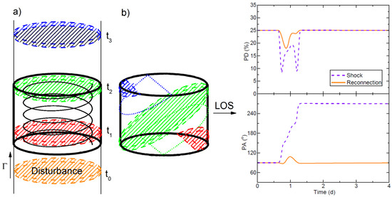 Left: sketch of the model and light crossing time. (a) a disturbance propagates through the emission region pervaded by a helical magnetic field in its comoving frame. Red, green, and blue colors denote the location of the disturbance at approximately entering (), leaving the emission region (), and some time after leaving the emission region (); (b) the corresponding flaring region at the to at equal photon-arrival times at the observer. Dashed shaded regions are the active region; the region between the dashed shaded region and the dotted shape is the evolving region. Right: time-dependent polarization signatures of shock and magnetic reconnection scenarios. Upper panel is the polarization degree, and the lower panel is the polarization angle. The calculation is performed by combining particle evolution code (3DHad) and the polarization-dependent radiation transfer code (3DPol). polarization angle is defined to be along the jet axis. The figure is reproduced from [32].