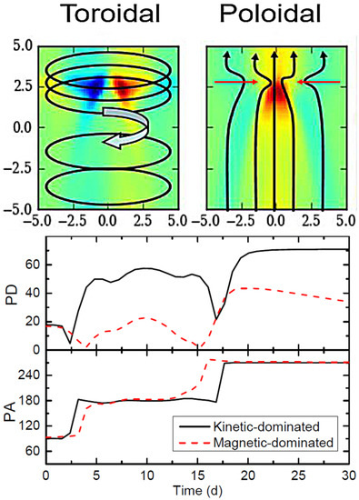 This provides a great chance to couple MHD simulations with polarized radiation transfer, so that we can track magnetic field evolution under first principles [38,39,40]. Indeed, for a kinetic-dominated jet, due to the strong shock compression (Figure 3), the magnetic field becomes highly ordered at the shock front. This results in a strong change in the polarization signatures—in particular, a very high polarization degree during flares. Additionally, the system cannot restore its initially partially-ordered magnetic field after the shock perturbation, and thus the polarization degree is still very high. However, for a magnetic-dominated jet, the change in the polarization is much smaller during flare, and we observe a clear restoration phase of the polarization signatures at the end of the flare. From optical polarization monitoring, we know that the polarization degree cannot be too high (mostly around ), and if a major change in the polarization happens, it will quickly go back to the quiescent state after the change [1,2]. This suggests that the optical polarization signatures prefer a magnetized jet environment. However, optical polarization can come from a larger region that may contaminate the polarization signatures in the most active particle acceleration regions. High-energy polarimetry will probe the most active regions to constrain how much the jet is magnetized.