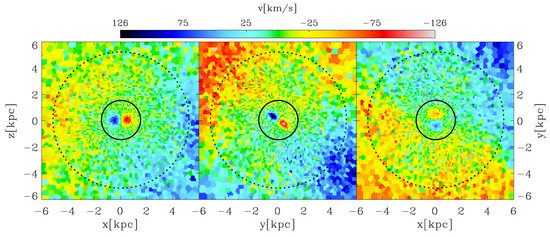 Each panel displays a LOSVD map of the central region of the merger remnant hosting the KDC in different projections at . From left to right: x–z plane, y–z plane and x–y plane. The color bar on the top indicates the velocity scaling adapted individually for each panel. The black solid circle marks the estimated KDC radius of , while the dashed circle indicates the half-mass radius.