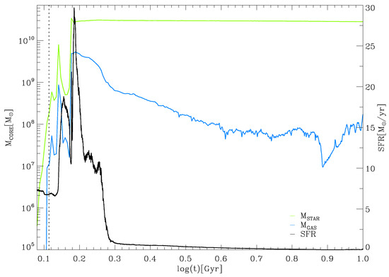Figure 2 displays the temporal evolution of the stellar (green) and gaseous (blue) mass within the core as well as the total SFR of the galaxy in black. The starting point in time is chosen to be directly before the second encounter to also capture the starburst triggered by the second encounter. This starburst lasts for approximately , with a maximum SFR of .