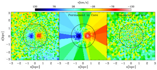 Left panel: LOSVD of the central in the x–z projection considering all stars in the line-of sight; central panel: LOSVD map of the central in the x–z projection taking into account stars that are determined to belong permanently to the KDC; right panel: LOSVD map of the central in the x–z projection including stars that only temporarily reside in the core. The panels share a common velocity scaling given in the color bar. The solid black circle indicates the core radius of .
