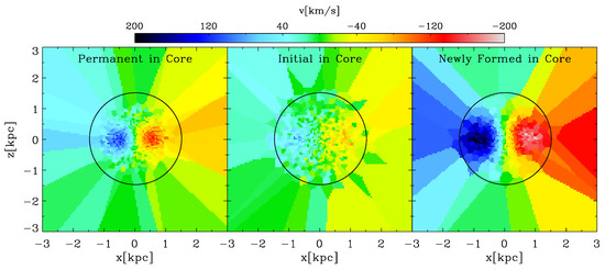 LOSVD maps of the central in the x–z projection. Left panel: all permanent core stars; central panel: permanent core stars that are initially in one of the progenitors; right panel: permanent core stars that are formed in situ during the simulation. The panels share a common velocity scaling given in the color bar. The solid black circle indicates the core radius of .