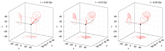 Illustration of the direction of the total stellar angular momentum in three-dimensional space as a red vector at three different time steps, of the simulation as given in the label. The red curves drawn on the coordinate planes trace the projected paths of the vector’s endpoint until its current position.