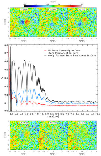 The upper and lower rows display a temporal sequence of the LOSVD maps of the central in the x–z projection visualising the gradual fade of the KDC. The main panel shows the temporal evolution of in the x–z projection split up into three stellar populations: All stars that reside inside the core at a given time are represented by the red curve, while the blue and black curve trace the evolution for the permanent core stars and the newly formed permanent core stars, respectively.