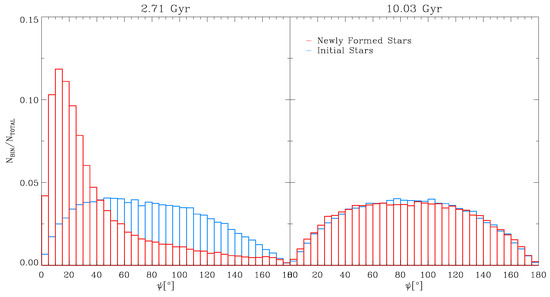 Distribution of the misalignment angles between the total stellar angular momentum vector of the KDC after and the angular momentum vectors of the individual stars inside the KDC. The newly formed stars are represented by the red histograms, while the blue histograms illustrate the initial stars. left: ; right: .
