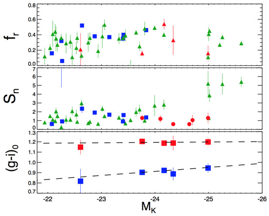 Sérsic index, n, as function of H absolute magnitude derived from 2MASS photometry. Blue circles show Virgo ellipticals from [14], while red symbols are our Las Cumbres sample.