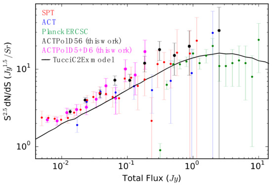 - Mocanu, L.M.; Crawford, T.M.; Vieira, J.D.; Aird, K.A.; Aravena, M.; Austermann, J.E.; Benson, B.A.; Béthermin, M.; Bleem, L.E.; Bothwell, M.; et al. Extragalactic Millimeter-wave Point Source Catalog number counts and statistics from 771 deg2 of the spt-sz survey. Astrophys. J. 2013, 779, 61–82. [Google Scholar] [CrossRef]