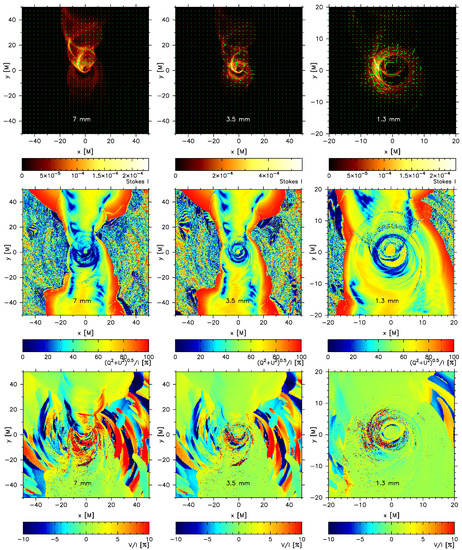 Figure 1 displays the apperance of the simulations scaled to M87 central supermassive black hole with its mass . We show the model in polarized light at three different wavelengths (= 7.0, 3.5 and 1.3 mm) at which the source is often observed [35,36,37]. The 1.3 mm synthetic images have been published in [16,18]. Here, we have extended our previous results to the other wavelengths.