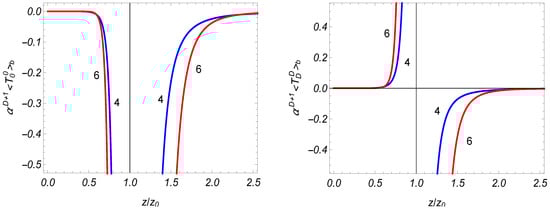 With the results given above, we can find the Casimir densities for the electromagnetic field in Randall–Sundrum braneworld model with a single brane (RSII model) [] (for reviews see [,]). The original model has been formulated on the AdS bulk with . Here we will consider the generalization for an arbitrary value of the spatial dimension. In terms of the coordinate (22), measuring the physical distance from the brane located at , the line element has the form