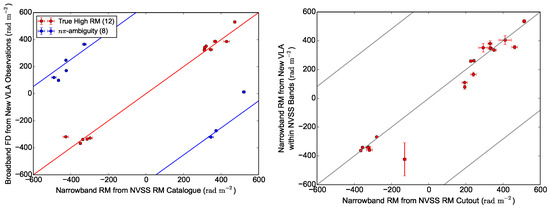 Left Faraday depths (FDs) from new Very Large Array (VLA) observations plotted against the rotation measure (RM) values in the NVSS RM catalogue. The data points should lie near the red line if FD/RM values from the two studies agree with each other (i.e., they are truly high-RM sources), or near one of the blue lines if they suffer from -ambiguity in the NVSS RM catalogue. Right RM from our new VLA observations using only the NVSS frequency bands against that obtained from NVSS RM cutout images. Both sets of RM values are obtained from performing the traditional fit, with -ambiguity resolved using the broadband FD values.
