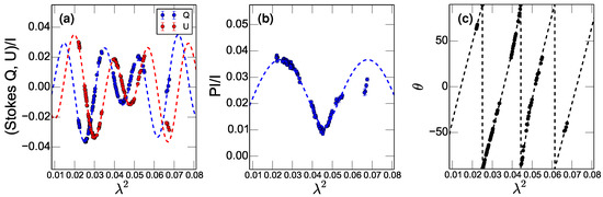 where n is an integer corresponding to the -ambiguity. This arises because the PAs measured by our instruments can only fall within . This restricts the relative Faraday rotation () to , although in reality it can fall outside of this range. The term removes this limitation but also introduces an ambiguity in the determination of RMs. In general, this ambiguity can be eliminated by having more PA measurements at different wavelengths. The broadband capabilities of modern radio interferometers (e.g., the Karl G. Jansky Very Large Array (VLA) and the Australia Telescope Compact Array (ATCA)) allow spectro-polarimetric observations with a continuous frequency coverage over a wide bandwidth (e.g., 1–2 GHz in L-band and 2–4 GHz in S-band for the VLA), which allows for the determination of FDs without ambiguities (e.g., [2]).