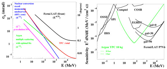 (Left) the three contributions to the single-photon angular resolution, namely the lack of recoil ion momentum measurement (blue), the single-track angular resolution (green), the single-track momentum resolution (cyan, assumed here to be of 10 %) and their total (red), as a function of the incoming photon energy, compared to that of the Fermi-Large Area Telescope (LAT); (Right) the point-like source sensitivity of a 10 kg gas time-projection chamber (TPC) telescope, computed à la Fermi-LAT, as a function of the incoming photon energy, compared to that of past and present telescopes. Both adapted from [7].