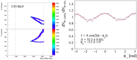 (Left) The two “maps” (i.e., the two and projections) of a conversion event of a 3.93 MeV -ray converting to an pair in the 2.1 bar argon-isobutane (95–5 %) gas of the HARPO TPC prototype. x and y are the two directions transverse to the drift direction in the TPC; t is the drift time. (Right) Distribution of the azimuthal angle of 11.8 MeV -rays (ratio of the fully linearly polarized to the linearly non-polarized) converting to an pair in the 2.1 bar argon-isobutane (95–5 %) gas of the HARPO TPC prototype [25].