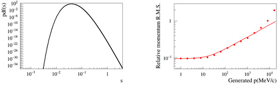 (Left) Bayesian probability density function as a function of s, the average multiple-scattering angle variance per unit track length, for a 50 MeV/c track in a silicon detector [30]. On that track, the momentum is measured to be equal to 49.9 MeV/c. (Right) The relative R.M.S of the measured momentum, as a function of the true track momentum, for a silicon detector (the curve is the parametrization of Equation (58) of [30]).