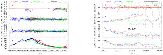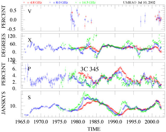 Figure 1 shows the time variability of the total flux density and the fractional linear and circular polarization and their spectral evolution for the bright quasar 3C 345. Although, initially, UMRAO data were obtained at 8 GHz only, the development of radiometer-polarimeter systems to detect linear polarization at 14.5 GHz in the 1970s, and shortly thereafter both linear and circular polarization at 4.8 GHz, added spectral information. Program sources included both ad hoc sources selected on the basis of flaring or other characteristics making them of special interest, as well as flux-limited samples used to investigate class properties; the latter include the UMRAO BL Lac sample [3], the Pearson Redhead sample [4,5], and the Stangellini sample of GHz-peaked sources [6]. The observing cadence for each source was based on the time scale of the total flux and linear polarization variability using the archived data as a guide and varied from two times a week for the most variable sources at the highest UMRAO frequency, 14.5 GHz, where the variations are highest in amplitude and most rapid, to only a few times a year for the less variable members of the flux-limited samples. Typically, 24 program sources were observed in a daily linear polarization run, and observations of calibrator sources were interleaved at 1.5 to 3 h intervals in order to monitor pointing and gain changes, and to verify the amplitude of the instrumental polarization. Circularly polarized emission (Stokes V) is typically only tens of mJy even in the stronger sources, and with the small aperture of the Michigan dish, Stokes V measurements required daily source integration times of approximately an hour, and averaging of these data over many days to obtain a 3- detection. Generally, circular polarization runs at 4.8 and 8 GHz were conducted over 2 consecutive days, while at 14.5 GHz where tropospheric effects were more severe, runs were 3 consecutive days in duration. The circular polarization data shown in this paper are two-week or monthly averages, and due to this binning, required to obtain significant detection levels of this weak emission, variations on timescales of a week or less cannot be studied. Comparisons of the UMRAO observations with contemporaneous centimeter-band circular polarization measurements obtained with the Effelsberg dish [7] and with the VLBA [8] show consistent amplitudes and polarity, and these complementary data confirm the accuracy of these difficult measurements.
