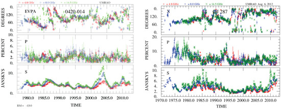 Observations of circular polarization were carried out in the late 1970s and early 1980s at 4.8 and 8.0 GHz. These measurements were subsequently dropped from the Michigan program because of the long integration times required for detections and the limited number of sources for which a 3- detection was expected. However, they were resumed in 2002 with the addition of a new radiometer–polarimeter system operating at 14.5 GHz, thereby increasing the spectral coverage. The new program was motivated, in part, by the suggestion by Ensslin [21] that the sign of Stokes V measures the rotational direction of the central engine, and that polarity reversals would be rare, providing a direct observational test of the Ensslin model by examining the long-term stability of the polarity. This new UMRAO program differs in scope from other centimeter-band programs which were concerned with detection statistics, or were conducted at one frequency only providing no information on the bandwidth of the emission, and generally time windows include only a few years e.g., [22,23]. Specific observational goals of the UMRAO program were to delineate the amplitude range of the Stokes V variations, to look for relations between the four Stokes parameters as tests of proposed emission mechanisms, and to investigate whether the polarity of Stokes V is stable on decadal timescales.