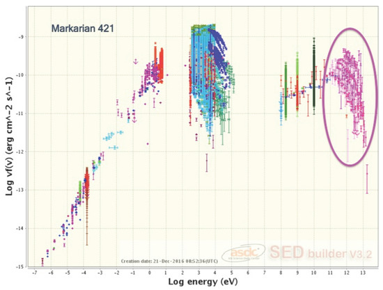 The multi-wavelength blazar spectral energy distribution (SED) of Mkn421. The marked VHE gamma-ray points are provided by the Brazilian Science Data Center (BSDC) database. The plot is made collecting data from a dozen catalogues spanning more than 30 years, collected by over 10 different instruments. They come from a number of catalogues which are integrated and made available online via Italian Space Agency (ASI) Science Data Center (ASDC).The plots are produced with SEDBuilder [10].