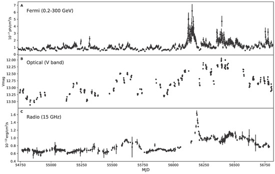 - Aharonian, F.; Akhperjanian, A.G.; Anton, G.; Barres de Almeida, U.; Bazer-Bachi, A.R.; Becherini, Y.; Behera, B.; Bernlöhr, K.; Boisson, C.; Bochow, A.; et al. (The HESS Collaboration). Simultaneous Observations of PKS 2155-304 with HESS, Fermi, RXTE, and Atom. Astrophys. J. 2009, 696, L150–L155. [Google Scholar] [CrossRef]