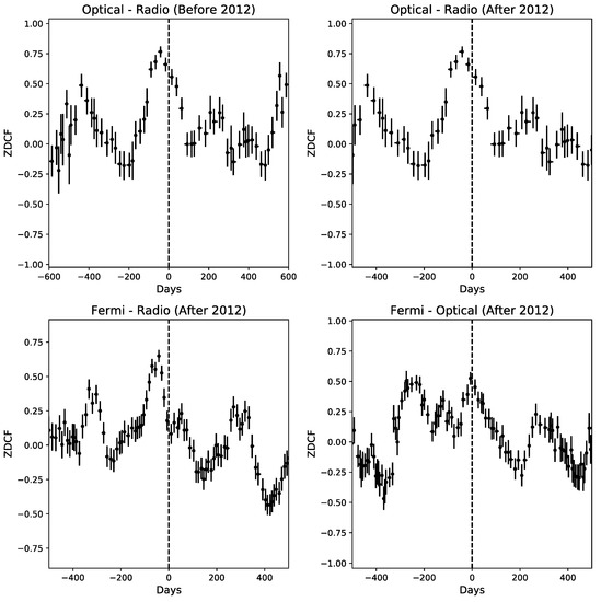 Since AGN light curves are very often unevenly sampled, we used the Z-transformed discrete correlation function (ZDCF [12]) to calculate the cross-correlation functions. Simulations show that the use of Fischer’s Z transform improve the performance in sparse light curves over the traditionally used discrete correlation function (DCF [13]). We calculated the cross-correlation functions between all three light-curves shown in Figure 2, before and after 2012. By using a maximum likelihood analysis [14], we could find the maximum of the correlation function and the fiducial interval. For the period from 2008 to 2012, the only indication of a correlation is between optical and radio:
