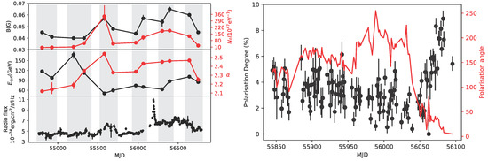 (left) The evolution of the parameters of the SED, with the periods chosen in gray, with the radio lightcurve on the bottom for comparison. (right) Polarisation angle and degree. The rotation of the angle can be seen around MJD 56040, right before the rise in the degree.