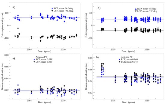 An example of R and L D-term phases and amplitudes for the PT antenna at 4.6 GHz (two IFs) and 15.4 GHz (four IFs) is shown in Figure 1. The results for other antennas and frequencies are available upon request from E.K. As can be seen, leakage solutions stay stable for almost four years. To calibrate the single-epoch R-L phase difference we minimize the difference between D-term phases over all antennas and IFs and the average antenna- and IF-based solutions, determined by connecting all available epochs. The contribution of antennas with low SNR can be neglected, while they show larger variations in the D-term phases. The resulting accuracy in determining absolute EVPA is of 4, 3, 5 and 7 for 4.6–8.4 GHz, 15.4 GHz, 23.8 GHz and 43.4 GHz, respectively. These values are comparable to those reported by, e.g., [,], obtained using the same method. The values of uncertainties in our estimates mainly depend on sparse observations of calibrators, which we used to anchor absolute EVPA. Meanwhile, this technique is still very effective. Unfortunately, it is not applicable to observations made after upgrade of VLBA receivers.