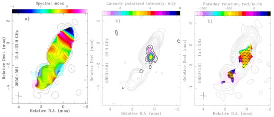 We registered high values of rotation measure from the regions, located 0.5–2 mas away from the core, which in deprojection corresponds to 12–50 pc. This suggests the presence of dense ionized gas surrounding the nucleus of 0850+581. The large inclination angle of the jet makes it possible to observe this medium, as the synchrotron emission passes through it. This might be the disk wind, broad or narrow line regions []. Linear polarization profiles indicate that this medium is located close to the jet emitting regions, since the excess is seen at a location where the jet bends and interacts with the surrounding medium. We do not see significant changes in spectral index at this region, which implies that there are no opacity changes. This dense gas may be responsible for the free-free absorption, which affects the emission in the counter-jet at low frequencies. Meanwhile, the spectral index value at 5.0–15.4 GHz is 2 which is consistent with both free-free and synchrotron self absorption. The further analysis of brightness temperature distribution might make it possible to distinguish between them.