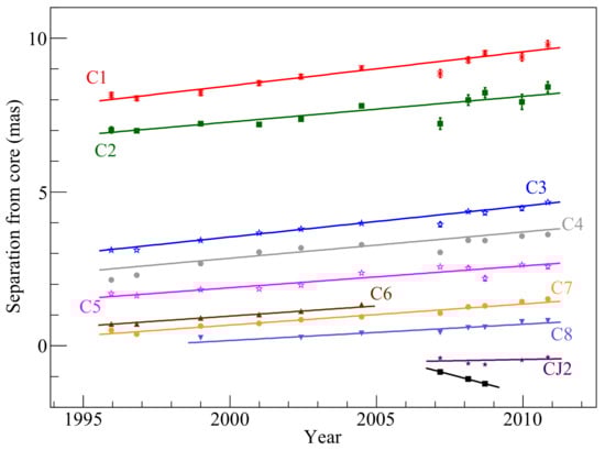 The separation of the modelled jet components from the core with time at 15.4 GHz. The solid lines represent a linear fit to the data points. The nomenclature for jet components has been adapted from [] and is shown by letters.