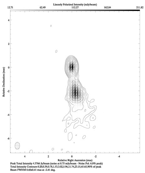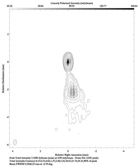- Gómez, J.L.; Lobanov, A.P.; Bruni, G.; Kovalev, Y.Y.; Marscher, A.P.; Jorstad, S.G.; Mizuno, Y.; Bach, U.; Sokolovsky, K.V.; Anderson, J.M. Probing the innermost regions of agn jets and their magnetic fields with Radioastron. I. Imaging BL Lacertae at 21 μ as resolution. Astrophys. J. 2016, 817, 14. [Google Scholar] [CrossRef]