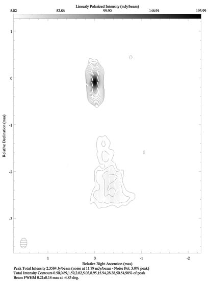 Figure 1, Figure 2 and Figure 3 show polarimetric VLBA images of BL Lacertae at 15, 22, and 43 GHz, respectively. The structure of BL Lacertae is dominated by the nuclear region plus an extended and bright structure towards the south. The electric vector position angle (EVPA) along the southern jet, and also along the nuclear region, are mainly aligned with the jet direction. This behavior is consistent with the presence of a helical magnetic field geometry, where the toroidal component is dominant over the poloidal one all along the pc-scale jet []. This behavior is consistent with previous results presented in [].