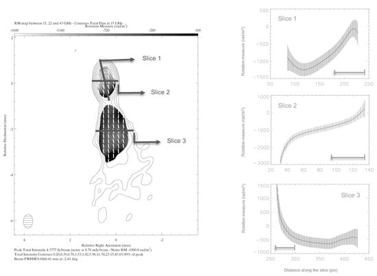 By inspecting slices 2 and 3 in Figure 4, we note a gradient of RM across the jet width, as it was observed in a number of sources [,,,].