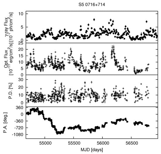 - Itoh, R.; Nalewajko, K.; Fukazawa, Y.; Uemura, M.; Tanaka, Y.T.; Kawabata, K.S.; Madejski, G.M.; Schinzel, F.K.; Kanda, Y.; Shiki, K.; et al. Systematic Study of Gamma-ray-bright Blazars with Optical Polarization and Gamma-Ray Variability. Astrophys. J. Lett. 2016, 833, 77. [Google Scholar] [CrossRef]