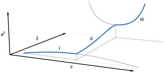 - For , we obtain an asymptotically de Sitter universe with a minimum allowed value for the scale factor. As in the previous case, a solution for was obtained in [22] in terms of Jacobi elliptic functions and [28]:where is the value of the conformal time when .