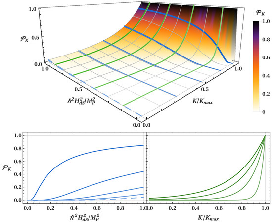 and we have, and . Notice that the presence of the factor in the exponent means that the tunnelling probability is highly suppressed for realistic values of the scale of inflation, , which lie in the range [30]. However, we find that this suppression can be counterbalanced in the cases of baby universes with large values of K, as approaches unity when . This can be understood as a consequence of the narrowing of the Euclidean region as we consider values of K closer to the maximum allowed value , thus making it easier for the wormhole to be traversed. These effects are clearly visible in Figure 2, where we present a 3-dimensional plot of the tunnelling probability as a function of and , as well as different curves of obtained by fixing one of these variables. In a blue dashed line we present the tunnelling probability in the case of creation from nothing [24], which corresponds to the first line in Equation (11).