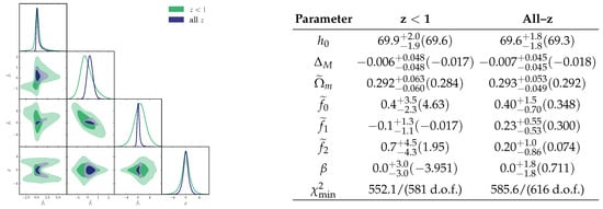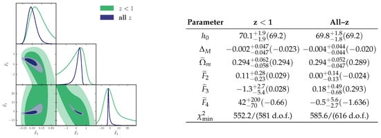 Figure 2. Results for F ( T ) theories for z < 1 and all–z as depicted in [46]. As can be seen, all model parameters are highly compatible with zero (i.e., with the Λ CDM limit), but F ˜ 3 and especially F ˜ 4 can deviate rather substantially from zero, particularly for the z < 1 analysis. Note that F ˜ j = F j / F 1 ( j = 2 , 3 , 4 ) , with F i = T i - 1 i F T i z = 0 .