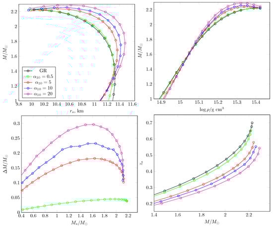 Figure 3. Upper panel: relation between the gravitational mass (M) and radius of the star for AP4 EoS in R 2 -gravity when compared with the General Relativity predictions (left); relation between the gravitational mass and the central density of the star (right). The symbol α 10 refers to α × 10 10 cm 2 . Lower panel: the dependence of the contribution of gravitational sphere into gravitational mass Δ M = M - M s with stellar mass M s m ( r s u r f a c e ) (left); surface gravitational redshift z s defined as z s = ( 1 - 2 M s / r s ) - 1 / 2 - 1 , where M s holds for the stellar mass, as a function of gravitational mass (right).