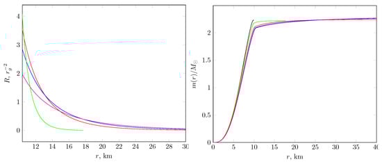 Figure 4. Left panel: Dependence of the scalar curvature outside the star for stellar configurations with maximal mass for AP4 EoS. Scalar curvature is given in units of r g - 2 c 4 / G 2 M 2 ). Right panel: the stellar mass profile m ( r ) for stellar configurations with maximal gravitational mass.