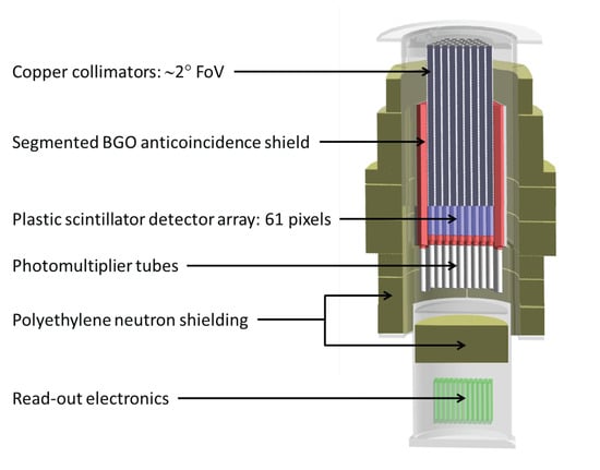 m of tin foils followed by the same thickness of lead foils. This “graded shield” construction of the collimators efficiently suppresses the out-of-aperture background of the measurements. The plastic scintillators are surrounded on the bottom and on the sides by a bismuth germanium oxide (BGO) anticoincidence shield, segmented into 61 pieces on the bottom of the instrument (one corresponding to each plastic scintillator) and 30 pieces on the side. The anticoincidence shield is 60 cm tall (compared to the 12 cm height of the plastic scintillators) and the thickness exceeds 3 cm on each side. Plastic scintillators and side anticoincidence shield elements are read out by the same type of photo-multiplier tube, a modified version of Hamamatsu R7899. In order to cancel out variations in response between individual detector elements, the entire detector array rotates during observations at a rate of 1