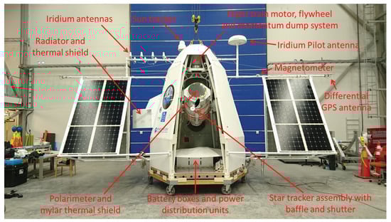 The polarimeter and gimbal unit assembly are housed inside a gondola structure designed and manufactured by SSC Esrange. The structure provides thermal shielding, mechanical stiffness for pointing stability, and protection during launch and landing. It consists of a six-sided light-weight framework with aluminum ribs and honeycomb composite plates. Solar panels and booms for the GPS and communication antennas are also affixed onto the structure, as is a radiator for expelling heat from the polarimeter electronics, using a fluid-based cooling system. During assembly and disassembly, the gondola can be separated into an upper part, housing the polarimeter, and a lower part, which contains batteries, communications equipment, and ancillary hardware. The assembled PoGO+ payload is shown in