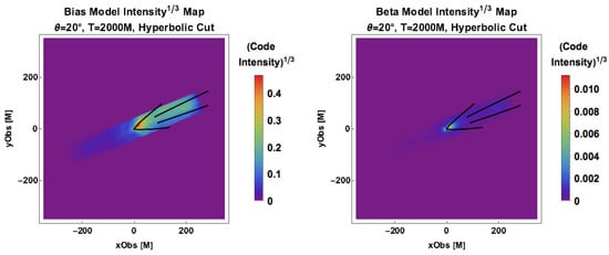 Intensity maps viewed at observer angle for a simulation where points away from the region have been excised to isolate the jets. The bias model (left) exhibits a broader and more realistic collimation profile than the model (right) compared to the observations (thick black lines). The figures have been transformed by for visual contrast.