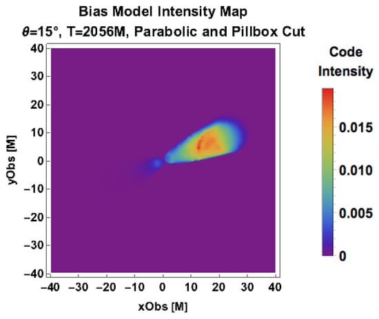 Jet intensity map at 15 viewing angle from jet axis. Emission is modeled as ( bias model). Using a parabolic region to subtract the disk, all regions away from the locus satisfying are set to zero. A counterpropagating jet is also visible.