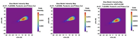 Jet intensity maps viewed at a observer angle for a simulation where points away from the region have been excised to isolate the jet and counterjet for the bias model. The left map is taken at observed time M, the middle map shows significant variation in the form of an increasingly ordered substructure at M, and the right map displays how the structure is degraded by convolution with a M Gaussian beam.